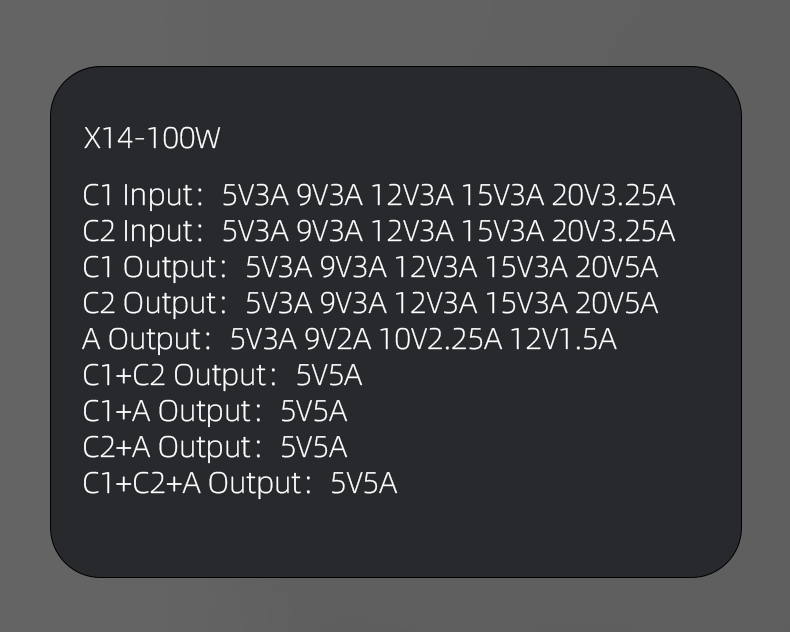 Type-C1/C2 Output: DC 5V/3A,9V/3A,12V/3A,15V/3A,20V/5A